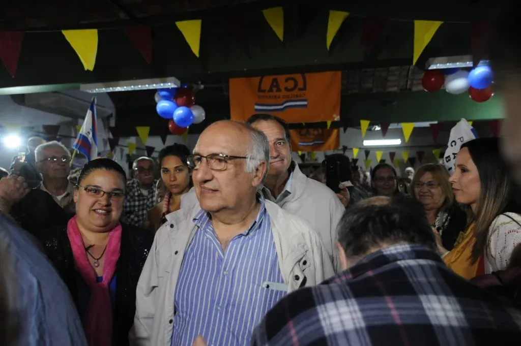 El candidato a la vicepresidencia, Guillermo Domenech, se para en la silla cuando le toca hablar. “Cabildo Abierto está para decirle a ese fiscal (Rodrigo Morosoli) que el caudillo de Cabildo Abierto no es ningún delincuente. No vamos a permitir que nos roben esta elección”, promete, y dice que “le inventaron un delito para cercenarle la carrera política”.