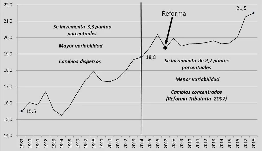 La presión impositiva se incrementó en el período 1989-2018 seis puntos porcentuales del PIB, pasando del 15,5% en el año 1989 al 21,5% en el año 2018 (véase gráfico). Esta variación equivale a un crecimiento acumulado del 40%, respecto a la presión impositiva existente a finales de los años 80.