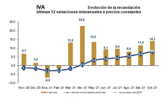 La recaudación del IVA alcanzó los $ 21.343 millones en octubre, representando de esta forma el 46,6% de la recaudación total bruta. En ese mes la variación real fue de 14,1%, y en el año móvil cerrado a dicho mes fue de 8%. A su vez, la variación real interanual del IVA en el período enero-octubre fue de 8,8%. Dentro de este tributo, hubo crecimiento del IVA interno (+7,9%) y sobre las importaciones (+25,6%).