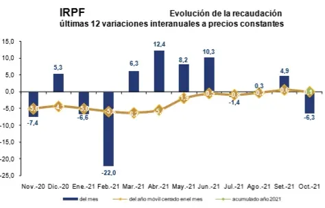 En tanto, la recaudación del IRPF alcanzó los $ 7.426 millones (16,2% del total). En octubre, la variación real tuvo un descenso de 6,3% y la del año móvil cerrado a dicho mes fue de 0,1%. A su vez, la variación real interanual en el período enero-octubre 2021 fue de 0,3%. La categoría I (IRPF sobre el capital) tuvo una caída de 0,7% el pasado mes, mientras que la categoría II (IRPF sobre la renta personal) cayó 7,4% interanual en octubre, según la DGI.