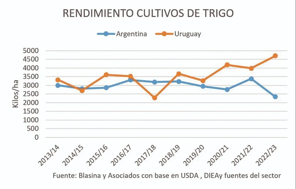 El diferencial con Argentina es notable, nunca Uruguay había duplicado en productividad de trigo al país vecino. Pero ahí parece estar jugando un fenómeno climático peculiar en las dos últimas Niñas, aunque llueve en Uruguay menos de lo normal, llueve lo suficiente. En Argentina la sequía es mucho más grave.