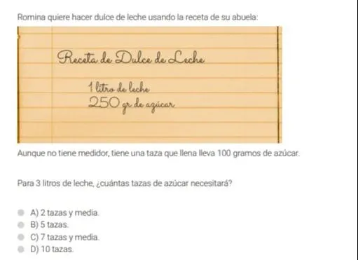 En la evaluación de matemáticas, todas los ejercicios tienen una aplicación a hechos de la vida cotidiana. Por ejemplo, la consigna de una de las actividades propone resolver cuántas tasas de azúcar necesita una niña (Romina) si quiere triplicar la receta de dulce de leche de la abuela. La receta original demanda 250 gramos de azúcar y la niña tiene una taza que lleva 100 gramos de azúcar. El ejercicio tiene cuatro opciones de respuesta: a) 2 tazas y media, b) 5 tazas, c) 7 tazas y media y d) 10 tazas.