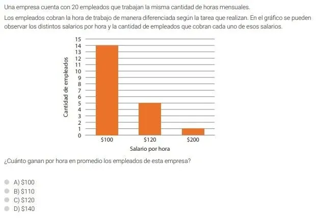 La evaluación también plantea el escenario de una empresa que tiene 20 trabajadores que trabajan la misma cantidad de horas mensuales pero donde 14 ganan $100 por hora, cinco ganan $120 y solo uno gana $200. El ejercicio se trata de resolver cuál es el salario promedio por hora en esa empresa. De nuevo, hay cuatro opciones: $100, $110, $120 o $140.