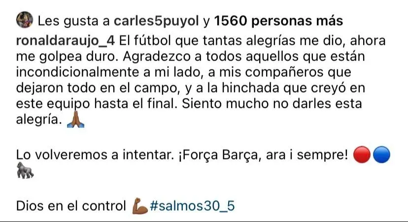 "El fútbol que tantas alegrías me dio, ahora me golpea duro. Agradezco a todos aquellos que están incondicionalmente a mi lado, a mis compañeros que dejaron todo en el campo, y a la hinchada que creyó en este equipo hasta el final. Siento mucho no darles esta alegría. Lo volveremos a intentar. ¡Forca Barca, ara i sempre!", manifestó el uruguayo.