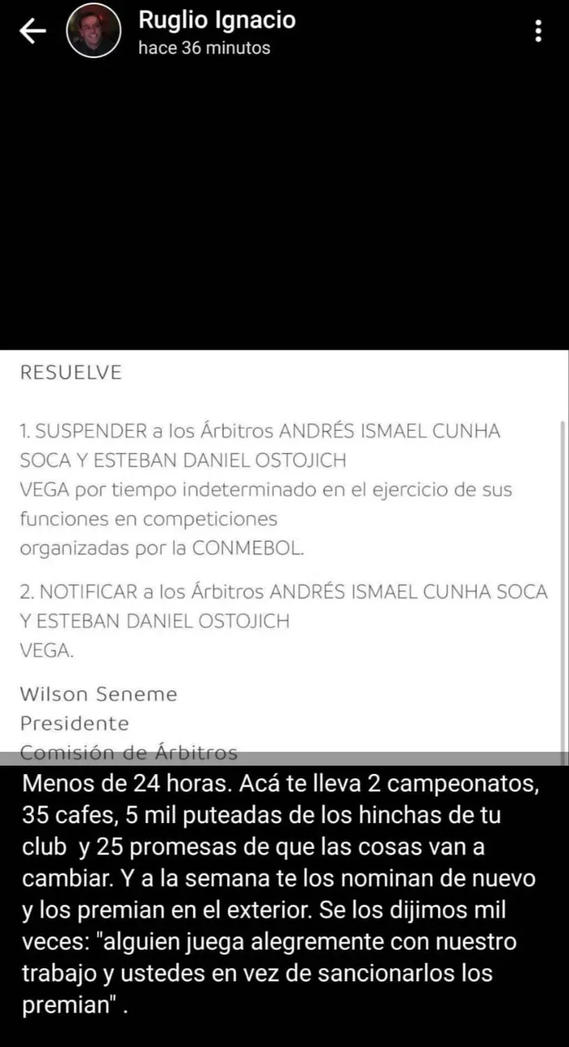 Lo que escribió Ruglio luego de que se conocieron las suspensiones por tiempo indeterminado por parte de Conmebol de Andrés Cunha y de Esteban Ostojich