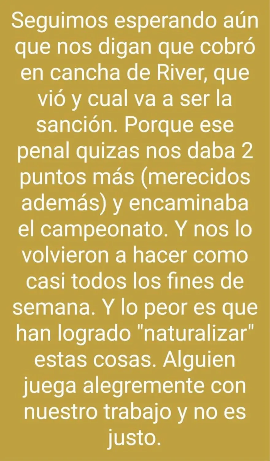 Posteriormente agregó otro texto: "Seguimos esperando aún qué cobró (Andrés Matonte) en cancha de River, qué vio y cuál va a ser la sanción. Porque ese penal quizás nos daba 2 puntos más (merecidos además) y encaminaba el campeonato. Y nos lo volvieron a hacer como casi todos los fines de semana. Y lo peor es que han logrado 'naturalizar' estas cosas. Alguien juega alegremente con nuestro trabajo y no es justo".