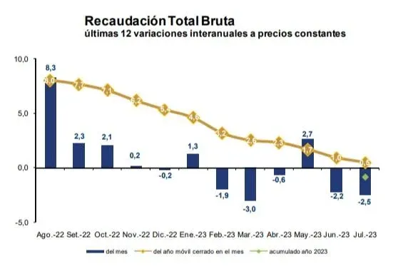 En julio la recaudación bruta cayó 2,5% en la comparación con igual mes del año pasado y acumuló cinco descensos mensuales en lo que va del año.