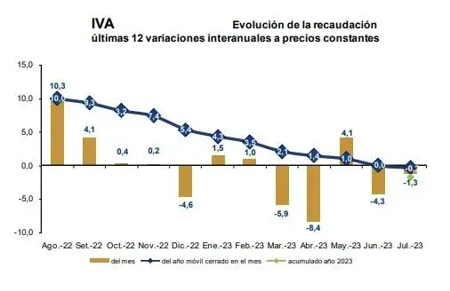 Los ingresos por IVA totalizaron $ 24.169 millones, con una variación real negativa de 1,3%, que es la segunda mensual consecutiva, y la cuarta en 2023.