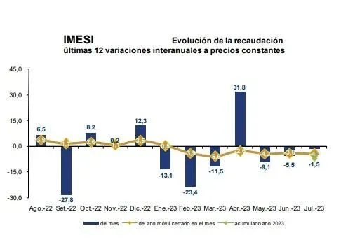 Por otro lado, la recaudación de Imesi fue de $ 3.744 millones y cayó 1,5% interanual, Es el tercer descenso mensual consecutivo en lo que va de 2023. Al interior de ese impuesto hubo comportamientos negativos en combustibles, automotores y bebidas, y crecimientos en tabaco, cigarrillos, y resto de Imesi.