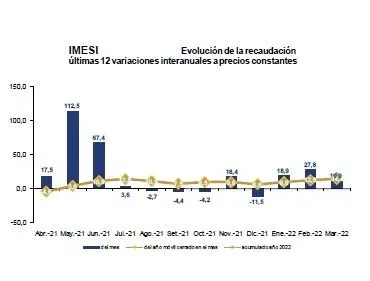 En tanto, la recaudación de Imesi alcanzó los $ 4.685 millones, y representó el 9,4 % de la recaudación total bruta, con una expansión anual de 18,7%. Aquí crecieron los ingresos por combustibles (25%), y disminuyó en tabaco, cigarrillos (-14,7%) y automotores (-13,6%).