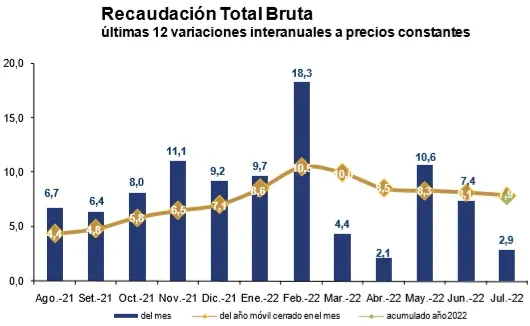 En el acumulado de los últimos 12 meses la suba de la recaudación bruta de impuestos interanual fue de 7,9%, mientras que en el acumulado enero-julio se expandió 7,6% en términos reales.