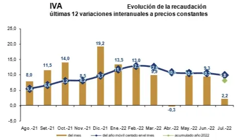 La recaudación de IVA totalizó $ 23.367 millones en julio y representó el 49,3% de la recaudación total bruta. En ese mes la suba real fue de 2,2% y de 8,1% en el acumulado enero-julio. En tanto, la recaudación del Imesi alcanzó los $ 3.626 millones y avanzó 6,1% en la comparación interanual y 3,1% en al acumulado anual.