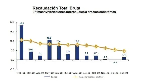 Para la comparación de combustibles se toma en cuenta la recaudación de enero del año pasado por ese concepto ($ 2.277 millones), con la total de enero 2023 que se compone de dos ítems (combustibles y emisiones CO2, que suman $ 1.711 millones).
