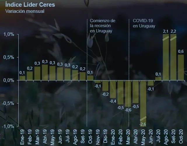 El Índice Líder de Ceres (ILC) tuvo su cuarto incremento consecutivo (+0,6%) en octubre, lo que reafirma la señal de salida de la recesión de la economía uruguaya, aunque muestra signos de moderación y dificultad para recuperar tendencia al crecimiento, según Ceres.