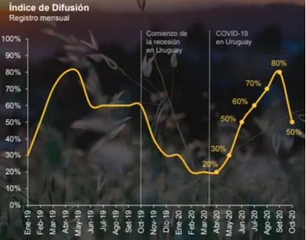 El Índice de Difusión de octubre fue 50%, lo que indica que la mitad de las variables que componen el ILC se comportaron de manera expansiva. El índice de Difusión había sido 60% en julio, 70% en agosto, 80% en setiembre, y baja a 50% en octubre. Eso marca debilidad de la tendencia; no siguió la generalizada mejora.