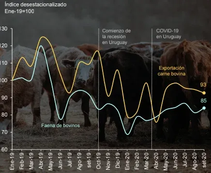 Por su parte, la exportación de carne bovina en toneladas se ha reducido 2,1% con respecto a agosto (desestacionalizado), y está 14,7% por debajo de su nivel de agosto de 2019.