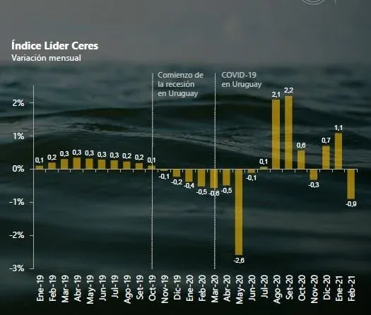 Tras ocho meses seguidos de recesión (noviembre 2019 a junio 2020), el índice Líder había logrado cuatro meses positivos (julio a octubre), pero luego dio negativo en noviembre, positivo en diciembre y enero, y nuevamente negativo en febrero.