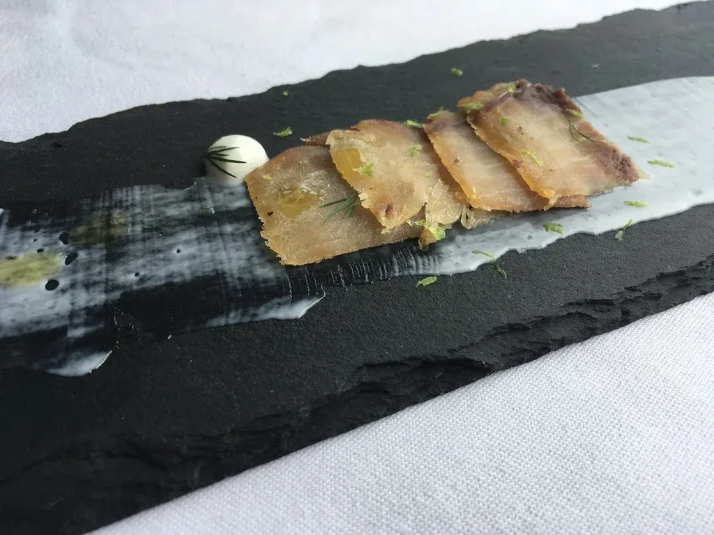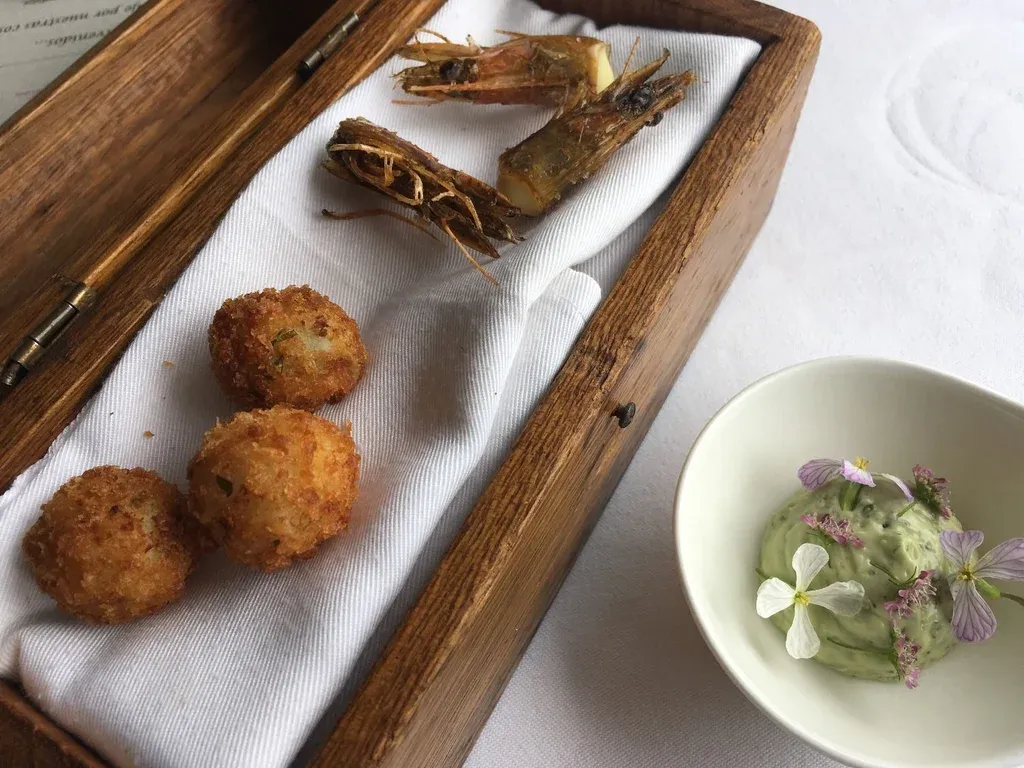El menú da comienzo con unos chicharrones de langostinos con una suave crema de limón. Las piezas se presentan como una joya preciosa, dispuestas sobre un fondo acolchado en el interior de un cofre de madera y se acompañan de una lactonesa de rabanito y cilantro. Para maridar los seis primeros pasos, el menú integra el Albariño de Garzón, cítrico y mineral, ideal para productos de mar. El segundo paso, servido sobre una pizarra -o piedra laja- son unas lascas de anchoa curada con salsa de coronilla ahumada, un plato que amarán los fanáticos de los salazones y la mojama.