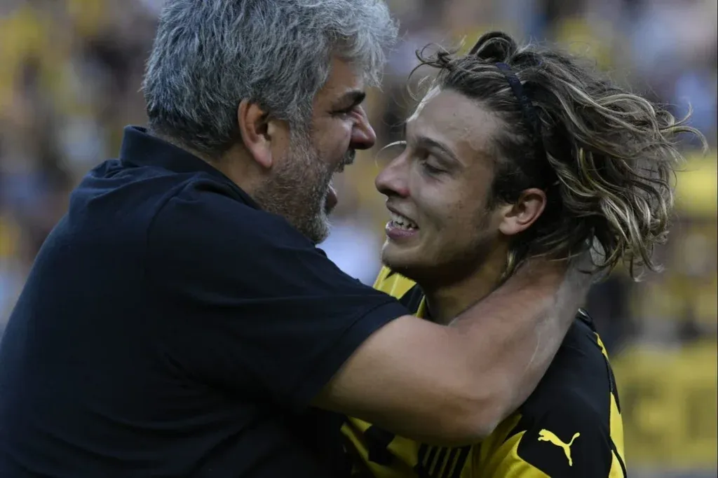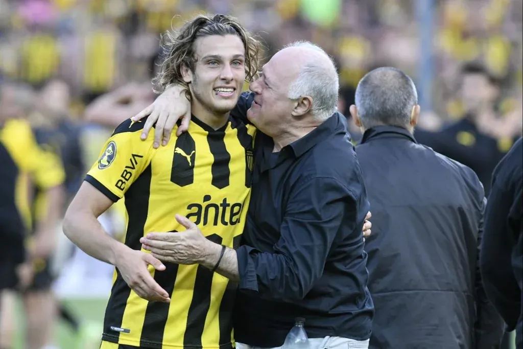 Canobbio recibe el saludo emocionado del secretario de Peñarol, Evaristo González