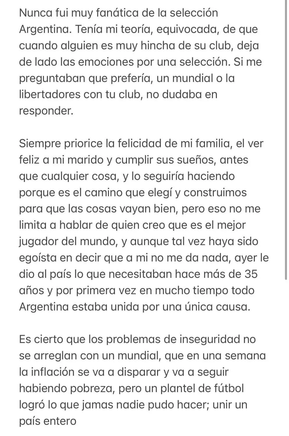 Siempre prioricé la felicidad de mi familia, el ver feliz a mi marido y cumplir sus sueños, antes que cualquier cosa, y lo seguiría haciendo porque es el camino que elegí y construimos para que las cosas vayan bien, pero eso no me limita a hablar de quien creo que es el mejor jugador del mundo, y aunque tal vez haya sido egoísta en decir que a mí no me da nada, ayer le dio al país lo que necesitaban hace más de 35 años y por primer vez en mucho tiempo todo Argentina estaba unida por una única causa.