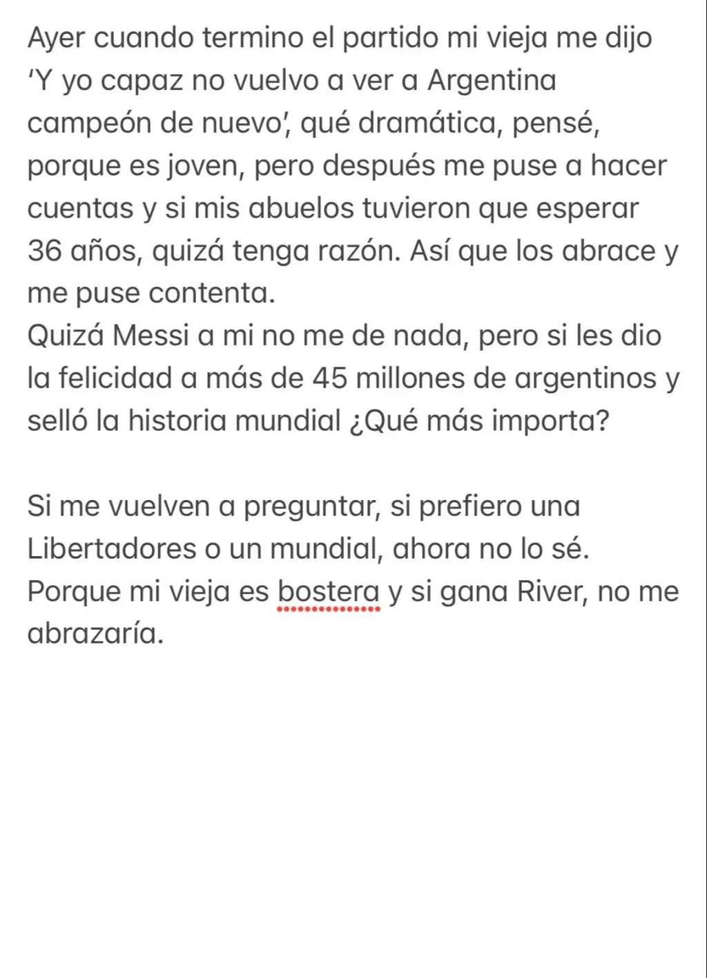 Ayer cuando terminó el partido mi vieja me dijo, ‘Y yo capaz no vuelvo a ver a Argentina campeón de nuevo’, qué dramática, pensé, porque es joven, pero después me puse a hacer cuentas y si mis abuelos tuvieron que esperar 36 años, quizá tenga razón. Así que los abracé y me puse contenta.