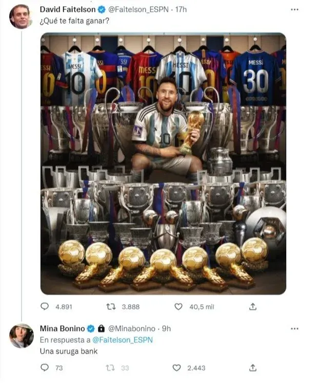 Además, ante la pregunta que realizó un periodista en Twitter, "¿Qué te falta ganar?", con una caricatura de Messi rodeado de copas conquistas por equipos y premios individuales, respondió con humor: "Una Suruga Bank".