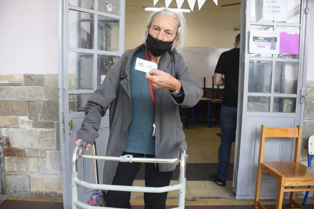 Mientras se acumula gente en el hall, Mirna intenta hacerse espacio. Camina lento pero con fuerza, empujando su andador. Tiene 86 años y vive en Brazo Oriental. Hoy la acompaña un vecino porque después de la muerte de su hermana vive sola. Mientras se traslada comenta: “Voto informada”. ”Porque el 90% no sabe qué vota”, agrega.