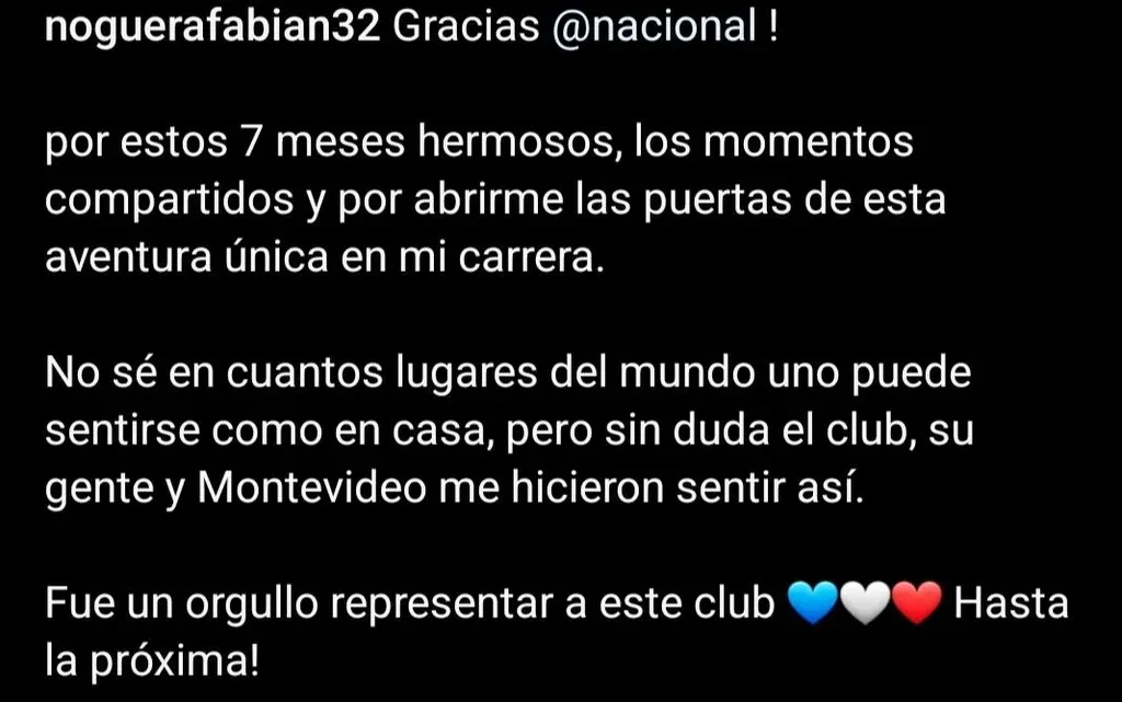 Allí sostuvo: "Gracias Nacional! Por esos 7 meses hermosos, los momentos compartidos y por abrirme la puerta de esta aventura única en mi carrera", comenzó escribiendo el zagureo.