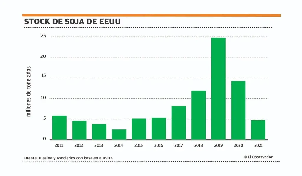 Como la del clima, otra película de suspenso es la del muy escaso stock de soja de los exportadores. EEUU plantó moderadamente dado el conflicto con China que generaba incertidumbre.