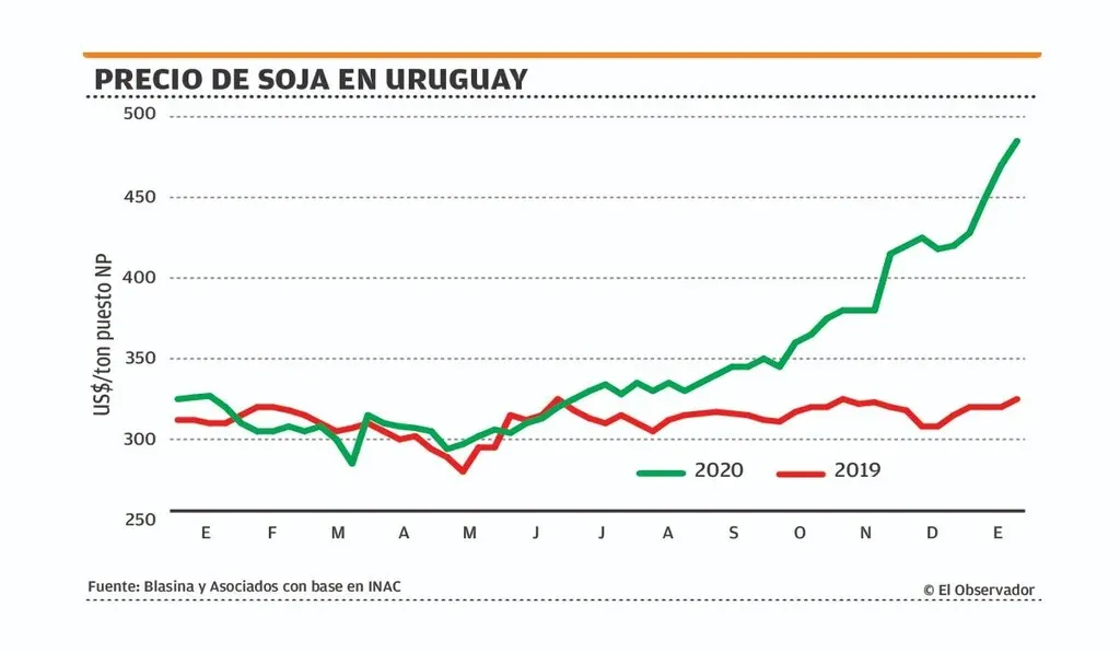 El paro de Argentina aceleró una lógica de fuerte suba de precios en la Bolsa de Chicago. La posición enero 2021 de la soja que un año atrás estaba sobre los US$ 350 la tonelada, pasó a US$ 503, máximo en en seis años y medio al cierre de esta nota. Para quienes recibieron lluvias, un regalo de Reyes. Porque en cuanto a precios para el productor uruguayo la zafra transcurre de la mejor manera.