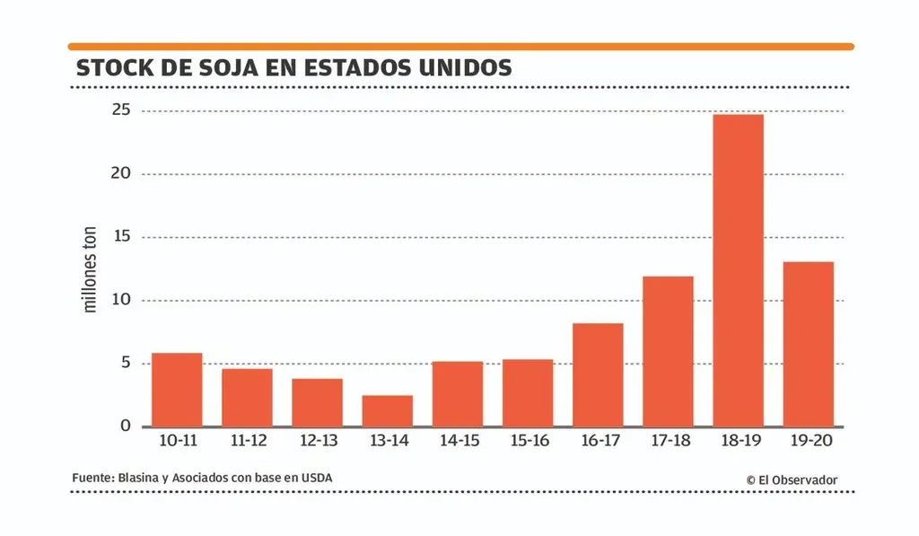 Según el Departamento de Agricultura de Estados Unidos (USDA), el stock de soja almacenada en ese país se redujo a la mitad respecto al año anterior, de 25 millones de toneladas a 13 millones de toneladas, pero aún así es el segundo más alto de la historia. Las reservas de Estados Unidos se ubicaban en mínimos de 2,5 millones de toneladas en 2014 y fueron gradualmente creciendo a fuerza de grandes cosechas hasta 12 millones en 2017, antes de dar el salto por la guerra comercial.