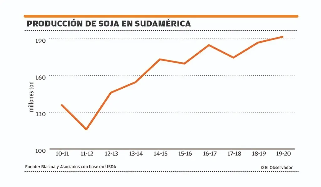 El mercado sojero acumuló un stock récord mundial de 111 millones de toneladas en 2018/19, en plena guerra comercial. En 2019/20 se redujo a 100 millones de toneladas. pero se mantiene muy por encima de los 60 millones de toneladas de 10 años atrás. Eso coincide con un consumo que aumenta moderadamente de 343 millones de toneladas en 2018/19 a 348 millones de toneladas en 2019/20.