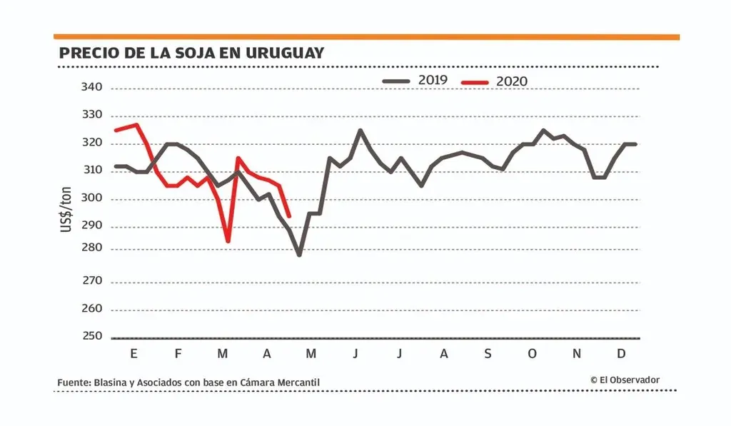 Y en Uruguay el precio de la soja en el puerto quedó esta semana por debajo de los US$ 300 la tonelada (US$ 297).