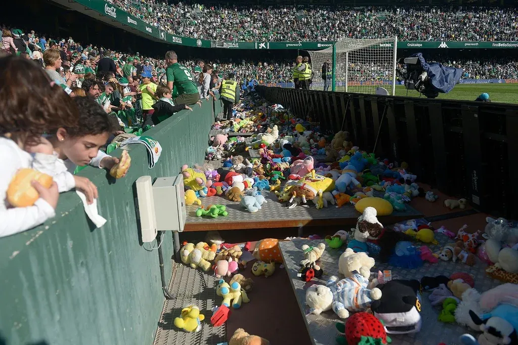 Los hinchas de Betis dieron una muestra de solidaridad inmensa al responder a la petición de su club de realizar una "lluvia de peluches" en el terreno de juego, con el fin de donárselos a familias de bajos recursos en la previa de las fiestas.