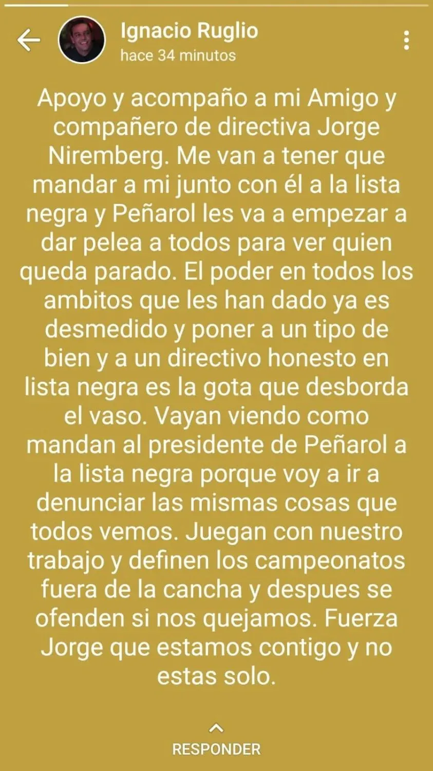 “Apoyo y acompaño a mi Amigo y compañero de directiva Jorge Niremberg”, escribió en su nota. “Me van a tener que mandar a mí junto con él a la lista negra y Peñarol les va a empezar a dar pelea a todos a ver quién queda parado”, agregó.