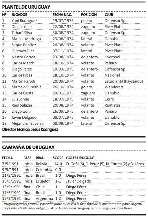 URUGUAY: Yani Rodríguez; Marcos Madruga, Diego López, Carlos Genta, Gustavo Díaz, Carlos Macchi, Sergio Benítez, Carlos Ribas, Néstor Correa, Diego Pérez y Diego Goñi. DT: J. Rodríguez.
