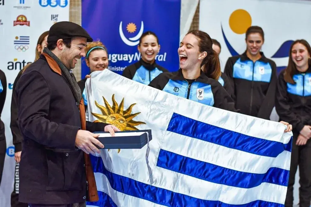 Eduardo Ulloa de la Secretaría Nacional del Deporte le dio la bandera a la capitana Manuela Machado