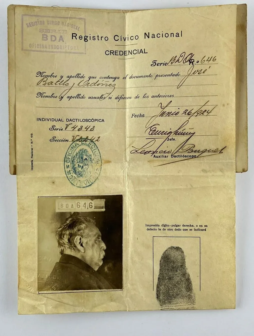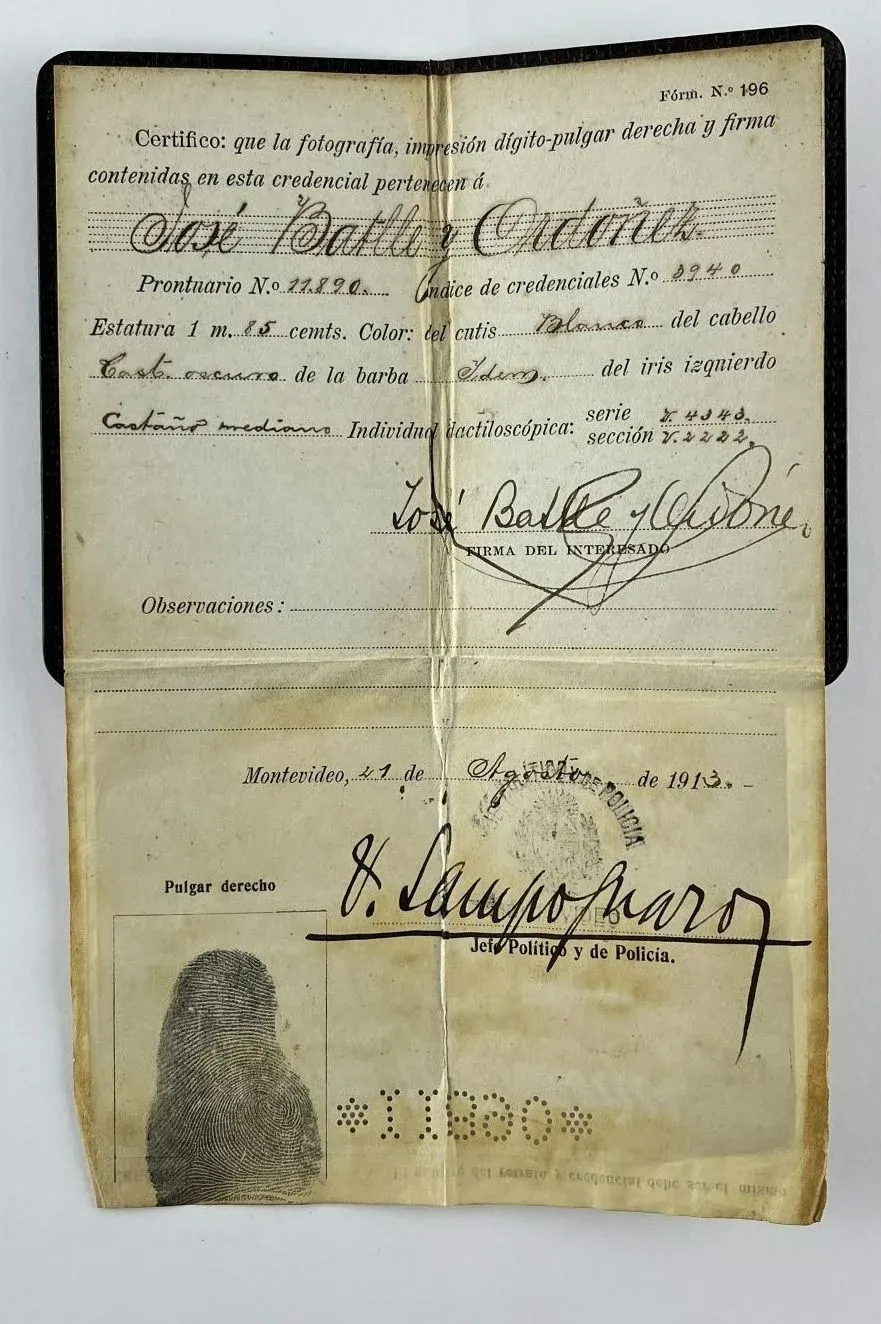 La credencial (lote 416) fue expedida en Montevideo el 26 de junio de 1924 por el Registro Cívico Nacional; tiene la fotografía y huella dactilar de José Batlle y Ordoñez. La encuadernación también es original. El precio base era de US$ 250.