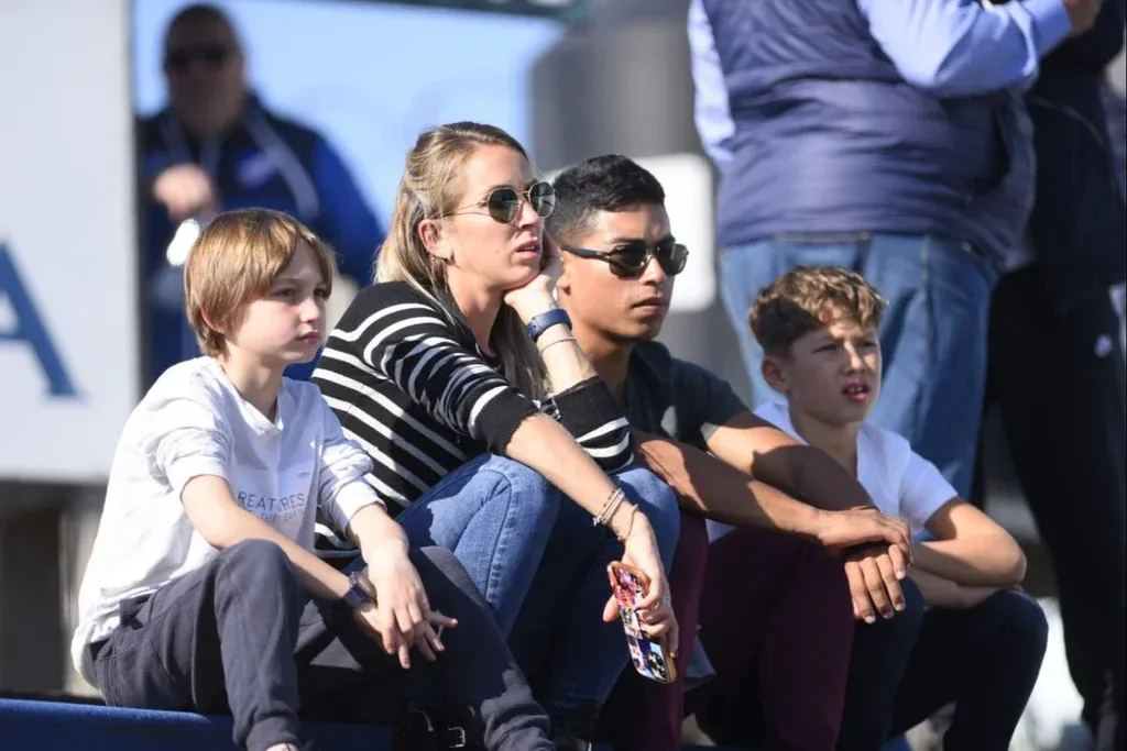 La esposa del delantero, que lo ha acompañado a lo largo de toda su carrera, no quiso ser menos en su primera salida en el futbol uruguayo y estuvo en el espacio destinado a los albos, siguiendo el partido sentada en los escalones de cemento junto a su hijo y familiares. El presidente José Fuentes fue a saludarla cuando la vio y charlaron un rato.