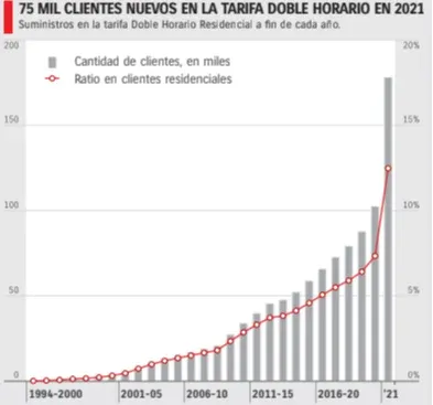 La contratación de tarifas residenciales de energía eléctrica en Uruguay vivió durante 2021 "un cambio trascendental", según un informe que divulgó la consultora energética SEG Ingeniería. La tarifa Doble Horario Residencial (DHR), más conocida como plan u opción inteligente, registró un aumento del 74% en el número de servicios contratados el pasado año. Incorporada en noviembre de 1993, la DHR fue durante 24 años la única alternativa tarifaria para los hogares uruguayos a la opción por defecto, la Residencial Simple (RS). Su contratación fue siempre muy baja, tanto que 20 años después de creada tan solo el 3,8% de los hogares la habían contratado.