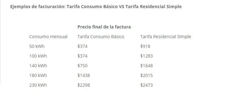 Bajo esta modalidad se factura un único cargo mensual de $ 374,4, que no está gravado con IVA y que incluye un consumo de hasta 100 kWh, el cargo fijo y el cargo por potencia contratada. Si se pasa ese nivel de consumo se cobra un cargo por energía de acuerdo a una escala de precios, que varía en función de lo que se consuma por arriba de esa cantidad. Cuanto más bajo es el consumo más se ahorra en comparación al importe de una tarifa Residencial Simple.