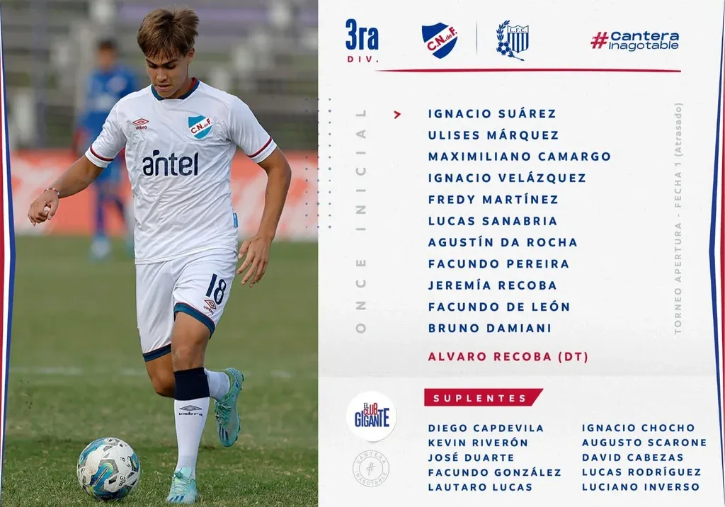 La tercera división de Nacional, que dirige “el Chino” Álvaro Recoba, goleó a Liveróol por 4-0 este lunes en la Ciudad Deportiva Los Céspedes, en un partido postergado de la primera fecha del Torneo Apertura.