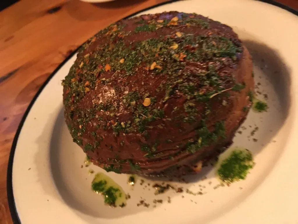 Culminado el hummus de aperitivo probamos la ensalada César, las alcachofas, de textura impecable, sobre una cama de Bagna Cauda, y el pimiento asado con mejorana, queso de cabra desgranado y flores de tomillo. Seguimos con la famosa provoleta cocinada a 500 grados con ají molido y orégano seco, los suaves buñuelos de espinaca, y el huevo grillado sobre polenta con una salsa casera de tomates y guisantes obscenamente sabrosa. El festín continuó con unas croquetas de langostinos, unos camarones panko con mayonesa de palta y una delicada, original y deliciosa criolla de mango, unos ravioles rellenos de alcauciles con tapenade de olivas negras y consomé de hinojos y los originales gnodis con burrata y berenjenas al rescoldo con un delicioso sabor ahumado.