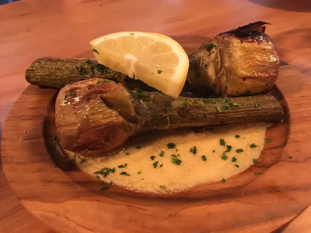 Casi 20 años después y a diez mil kilómetros de distancia, me conmueven unas alcachofas tumbadas sobre un manto de bagna cauda y la sonrisa bonachona de un hombre que ama el fuego. Por algún motivo esta nota no puede ni debe llevar otro nombre. En esta casa gobierna un fuego feroz arrojado por un dragón que se escurre y se esconde con sigilo entre los hierros. Las manos sabias y tiernas transforman el producto en audaz alimento. Estamos en la Cantina del Vigía, frente a la torre que antaño vigilaba con su ojo panorámico el estado de situación de la bahía.