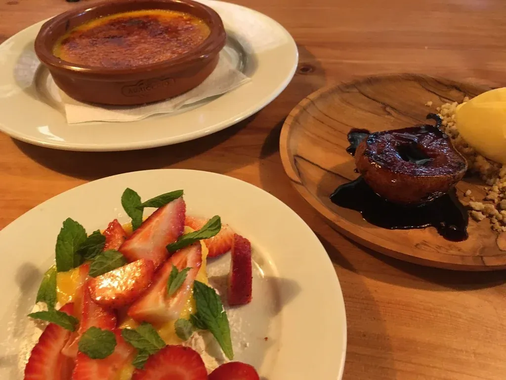 No fuera a ser que nos hubiéramos quedado con hambre, Lucila Zusmanovsky, pastelera de la casa y guardiana de los fuegos, apareció con una degustación de postres que incluyó una crème brûlée con dulce de leche, una pera asada al vino blanco con azúcar orgánica, crumble y helado de vainilla y una pavlova con un excepcional curd de limón y frutilla.