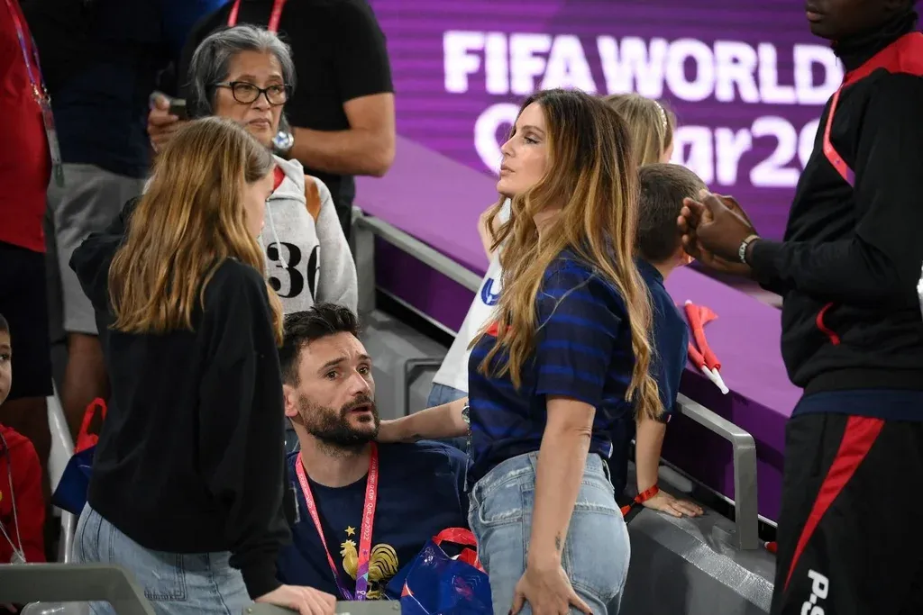 También tuvo un rato de distención en familia en pleno estadio y en el post partido, el golero Hugo Lloris, con su esposa Marine.
