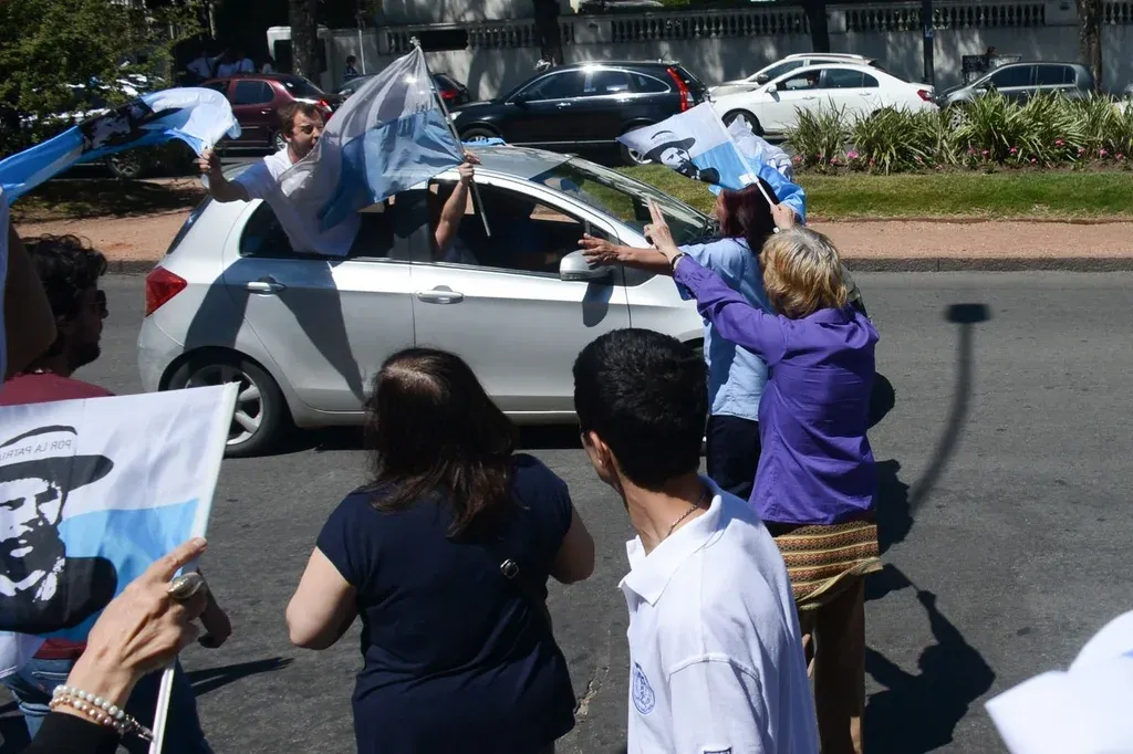 Primero fueron algunas mujeres con banderas. Luego camionetas, autos y camiones desde los que los votantes saludaban y gritaban “presidente”. En pocos minutos, la entrada de la sede quedó bloqueada por banderas celestes y blancas, junto con algunas coloradas y de Cabildo Abierto. Una botella de champán agitada largaba espuma y mojaba a los transeúntes. Vendedores ambulantes de banderas se instalaron en el cantero del bulevar para aprovechar la que, estimaban, iba a ser la venta del día, o de la semana. “Se van, se van”, gritó un hombre desde un ómnibus que pasaba expreso. El festejo había comenzado.