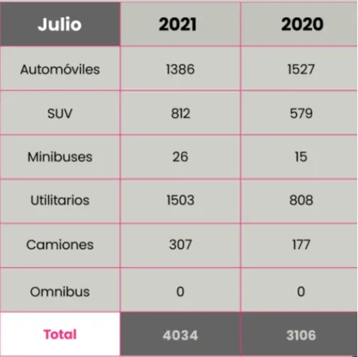 El mercado automotor de vehículos 0 km continúa mostrando un fuerte dinamismo y recuperación en 2021. En julio, se colocaron 4.034 unidades nuevas con una expansión del 30% en la comparación interanual (unos 1.000 vehículos más que en julio del año pasado).
