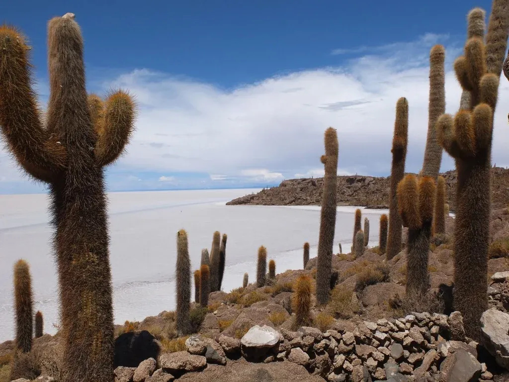 La isla Inca Huasi (Casa del Inca, en quechua) tiene un perímetro de casi dos kilómetros y una altura máxima de 102 metros. En la cima, a la que se accede a través de un camino entre cactus gigantes, hay un centro ceremonial desde donde mejor se aprecia el imponente panorama y se vive el silencio, atronador, tronchado solo por el murmullo de los fuertes vientos.