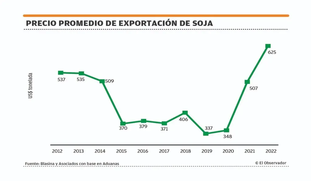 La zafra de soja 2021/22 —que está a punto de culminar— será una de las mejores de la historia desde distintas aristas. Según una estimación que divulgó Blasina y Asociados en El Observador hay un resultado que supera las expectativas que había cuando se realizó la siembra, que se sustenta en un rendimiento por encima de lo esperado (alcanzará los 3.000 kilos por hectárea en promedio), a valores por encima de los US$ 600 por la tonelada a la venta que no se esperaban y con una excelente calidad de grano.